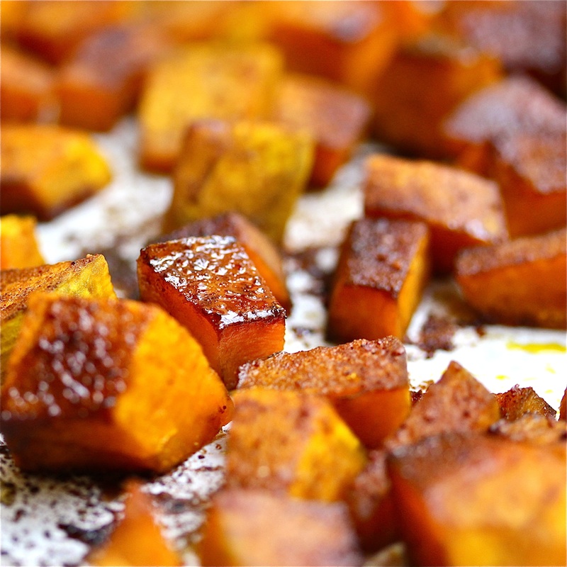 For this recipe I chopped the kabocha up into bite-sized cubes, tossed them in olive oil and dusted them with a rub of coffee, chocolate and brown sugar. Coconut sugar works great in this rub too.ย I roasted them until they were tender.