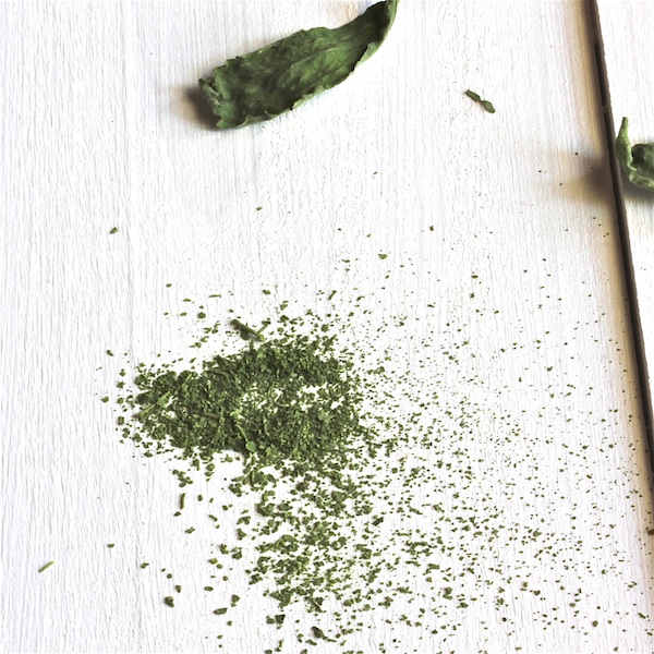 I wash the harvested leaves, dry them thoroughly, and place them on a paper towel in a sunny area of my kitchen to dry out. Here in the mountains, it takes about three days for them to be dry enough to crumble into a powder.