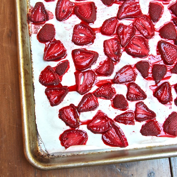 - Hull the strawberries, removing their leafy top, and slice into ¼” thick slices. Arrange on the baking sheet and roast for 40 minutes. When done, the strawberries should be limp, and somewhat dried out with some juices running across the parchment paper.