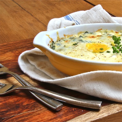 - Separate the chard into 2 gratin pans, each of which are suitable for a single serving, and form two wells in each gratin large enough to accommodate the eggs.