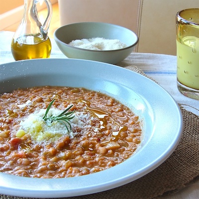 After all, Italy is not a country of refined, delicate soups that have been triple strained to get a velvety texture. To the contrary, Italian soups have opinions, and openly flex their muscles. Think Earnest Hemingway, defined by heft and texture. If partially puréed, the ingredients are never annihilated into the beige silk of a Vichyssoise. In Tuscany, you see the beans, celery and carrot, and taste each of them. There's no subterfuge by blending in cream, generally; what you see is what you get.