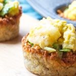 Hash browns cups stuffed with scrambled eggs, avocado and cheese curds.