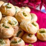 Rest a jalapeño slice on each gougére, and top with a pinch of grated cheddar.