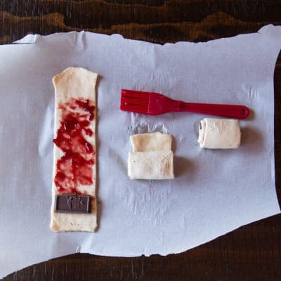 Place a half square of chocolate at one end of the puff pastry strip over the jam. Fold the end of the pastry over the chocolate, and carefully roll it almost to the end of the strip. Baste the end of the strip with egg white. Complete rolling, and place on the baking sheet with the seam facing down.