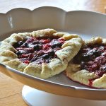 Remove the one disk of dough from the refrigerator, unwrap, and roll out into a circle about 7 - 8 inches in diameter. Place it towards one of the corners of the baking sheet. Heap some strawberry filling in the middle. It's fine if it spreads out. Carefully fold the edges of the dough towards the middle.